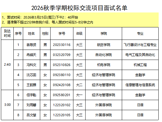 2026秋季学期校际交流项目面试须知