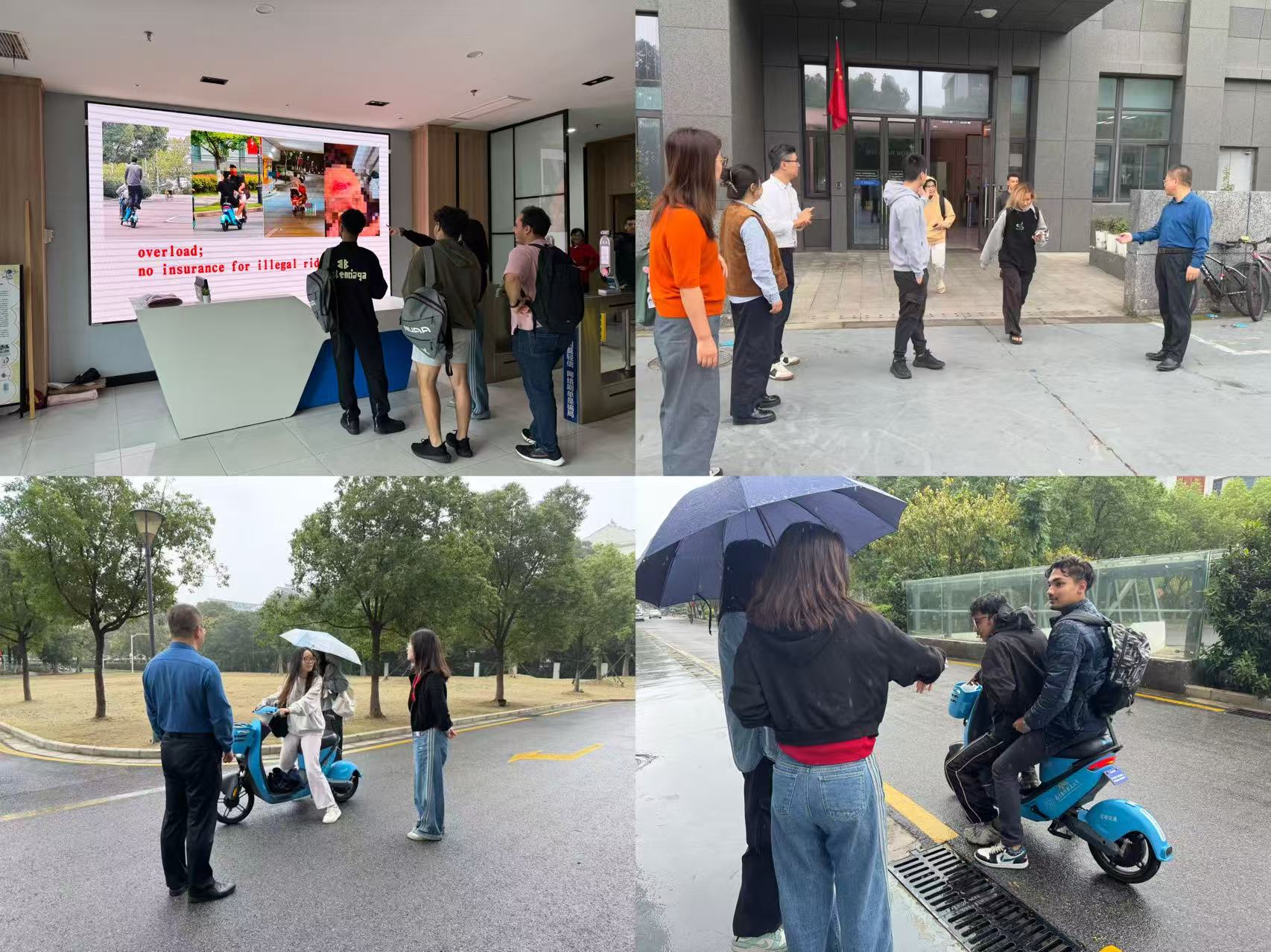 14日开始,学院在留学生宿舍楼一楼大屏幕循环播放此前因不当骑行电动自行车引发安全事故的相关图片,以真实的案例向留学生们直观展示违规骑行的严重后果,以视觉冲击给学生们敲响安全警钟。同时,学院领导带领辅导员们在早晨7:40、上午9:50和下午1:40等上下课重点时段进行了连续两天的专项集中巡查,制止违规骑行行为,对学生进行安全教育。