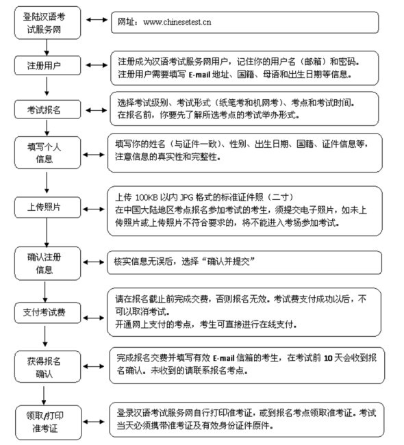 考生可登陆汉语考试服务网(www.chinesetest.cn)进行HSK考试报名。